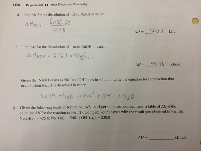Solved Find Delta H For The Dissolution Of 1 00 G Naoh In Chegg Com