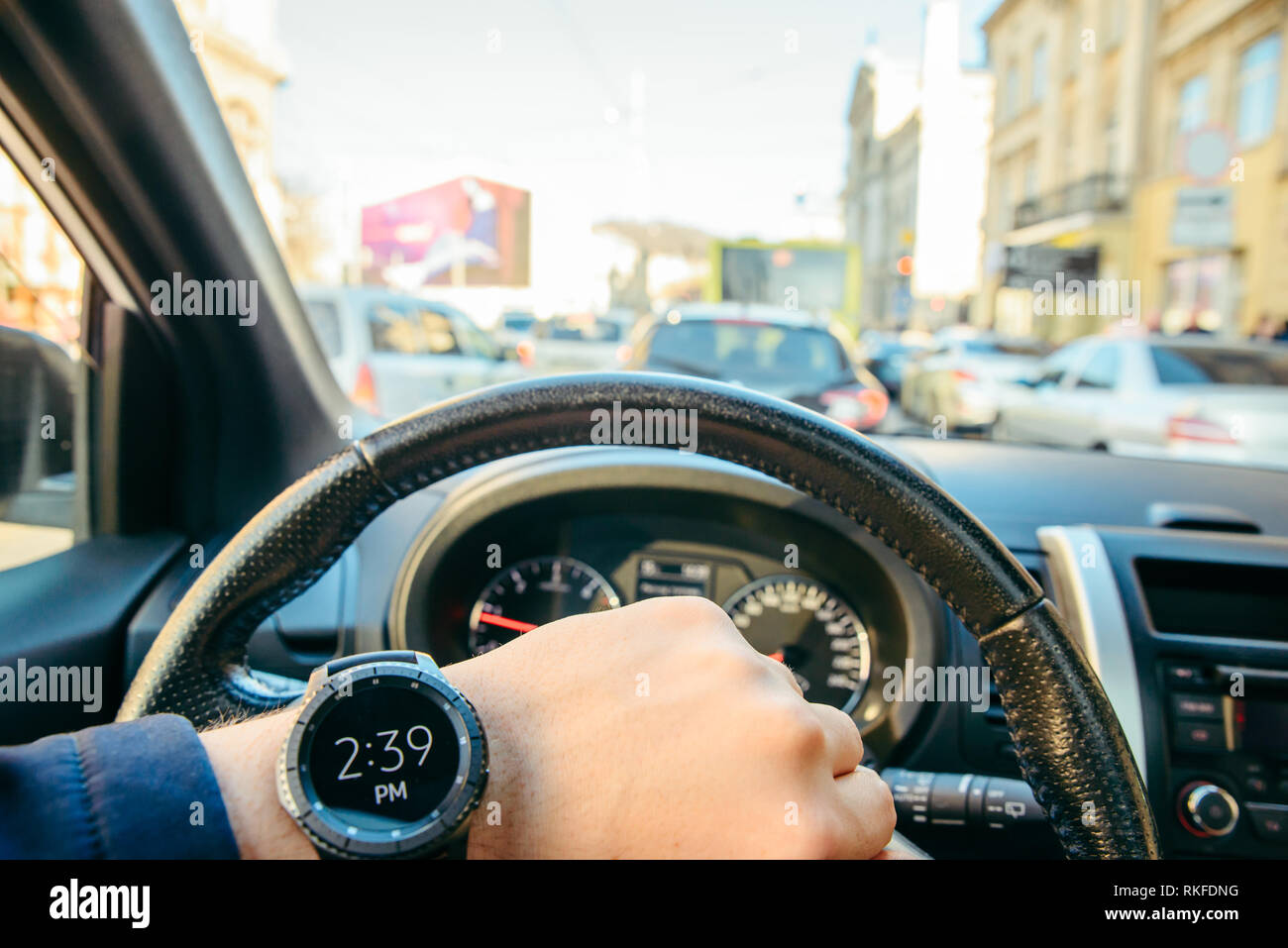 Man Driving Car In City Traffic Looking On Watch First Person View Late For Meeting Stock Photo Alamy
